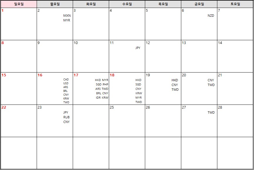 통화별 은행 휴일 안내 입니다.